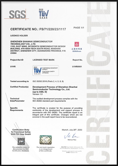 山海半导体汽车功能安全产品开发流程体系获得国际公认的测试、检验和认证机构SGS认证。8月16日, 在山海半导体上海研发中心,SGS向山海半导体颁发了ISO 26262:2018半导体功能安全ASIL D流程认证证书,标志着山海半导体已形成完全符合半导体功能安全最高等级“ASIL D”级别的产品开发和管理流程体系。