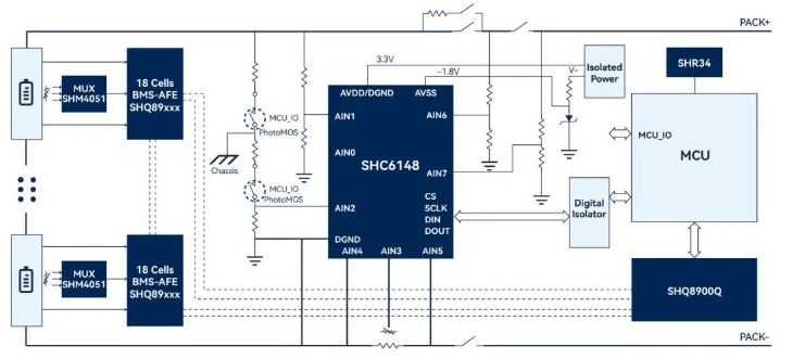 山海高性能高精密AFE系列SHC6120, SHC6148面向储能BMS高压监测应用,打造一站式软件硬件解决方案,提供完整软硬件参考设计,免开发便捷应用,整体方案产线免校准。
